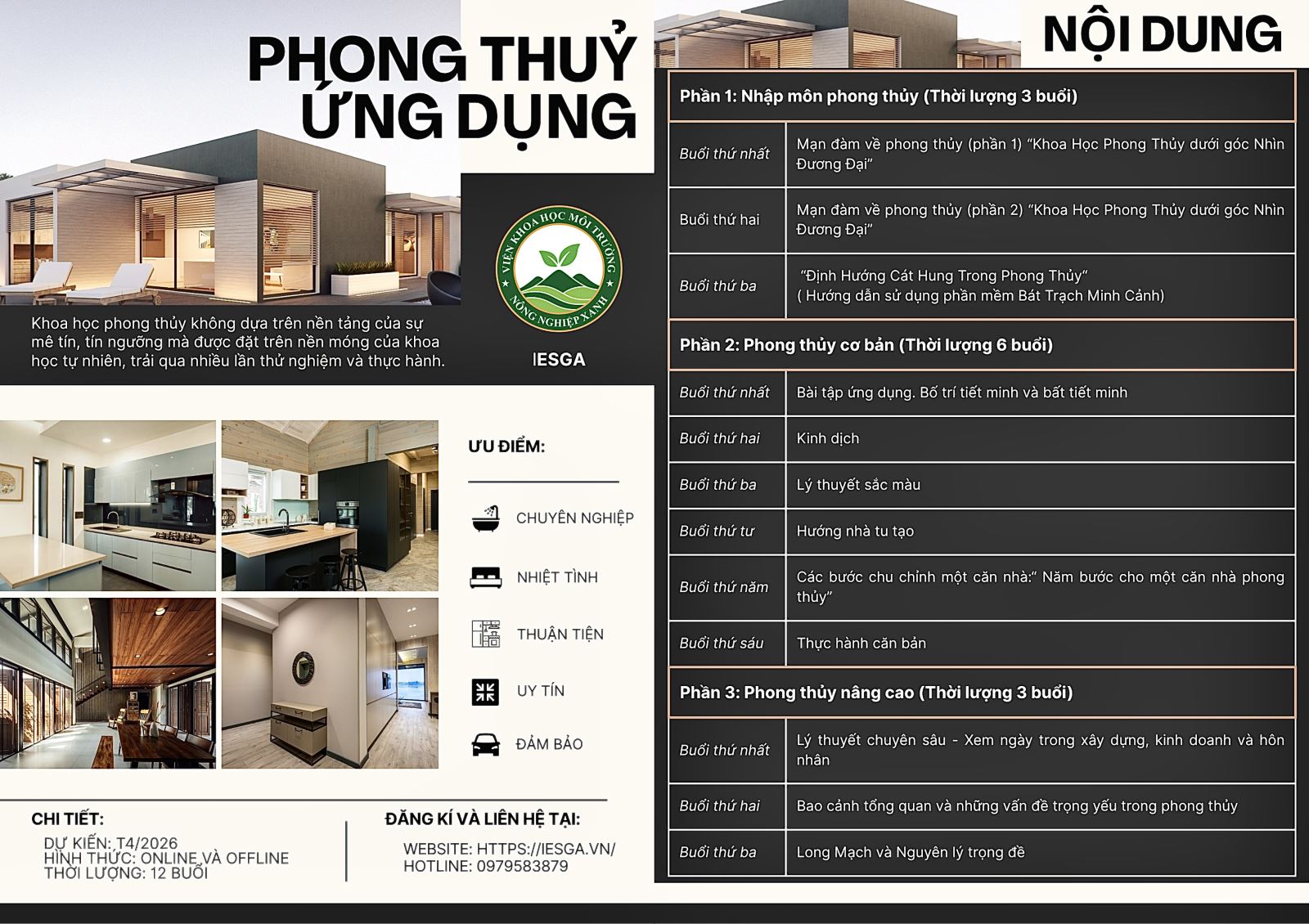 Thuật phong thủy là phương pháp nhằm xác định và tìm kiếm địa thế đẹp làm nơi an cư, kinh doanh hoặc mai táng để mang lại cát khí, điềm lành, và sự phú quý - hiển vinh. Khoa học phong thủy không dựa trên nền tảng của sự mê tín, tín ngưỡng mà được đặt trên nền móng của khoa học tự nhiên, trải qua nhiều lần thử nghiệm và thực hành. Do đó, các bạn cần phải tham gia các khóa học nhân tướng học, khóa học phong thủy ứng dụng để có thể hiểu hơn về thuật phong thủy. Nhằm đáp ứng nhu cầu thực tế đó, VIỆN KHOA HỌC MÔI TRƯỜNG VÀ NÔNG NGHIỆP XANH triển khai “Khóa học Phong Thuỷ Ứng Dụng”